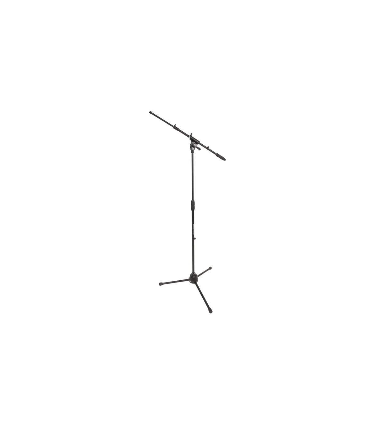 Soporte de micrófono boom telescópico profesional con base de trípode, articulación superior de aluminio fundido a presión y tubos de acero grueso para una estabilidad óptima. El nuevo concepto de articulación superior presenta componentes ergonómicos y de alta calidad que aumentan la fricción y permiten ajustes precisos. También incluye un manguito central de aluminio fundido cubierto con goma "soft-grip" que permite un agarre firme para un ajuste de altura fácil y seguro. Equipado con una rosca de 3/8" con adaptador de 5/8". Disponible en negro mate.