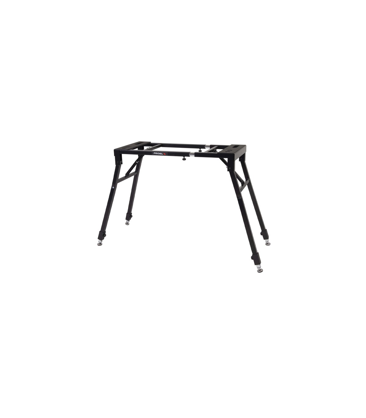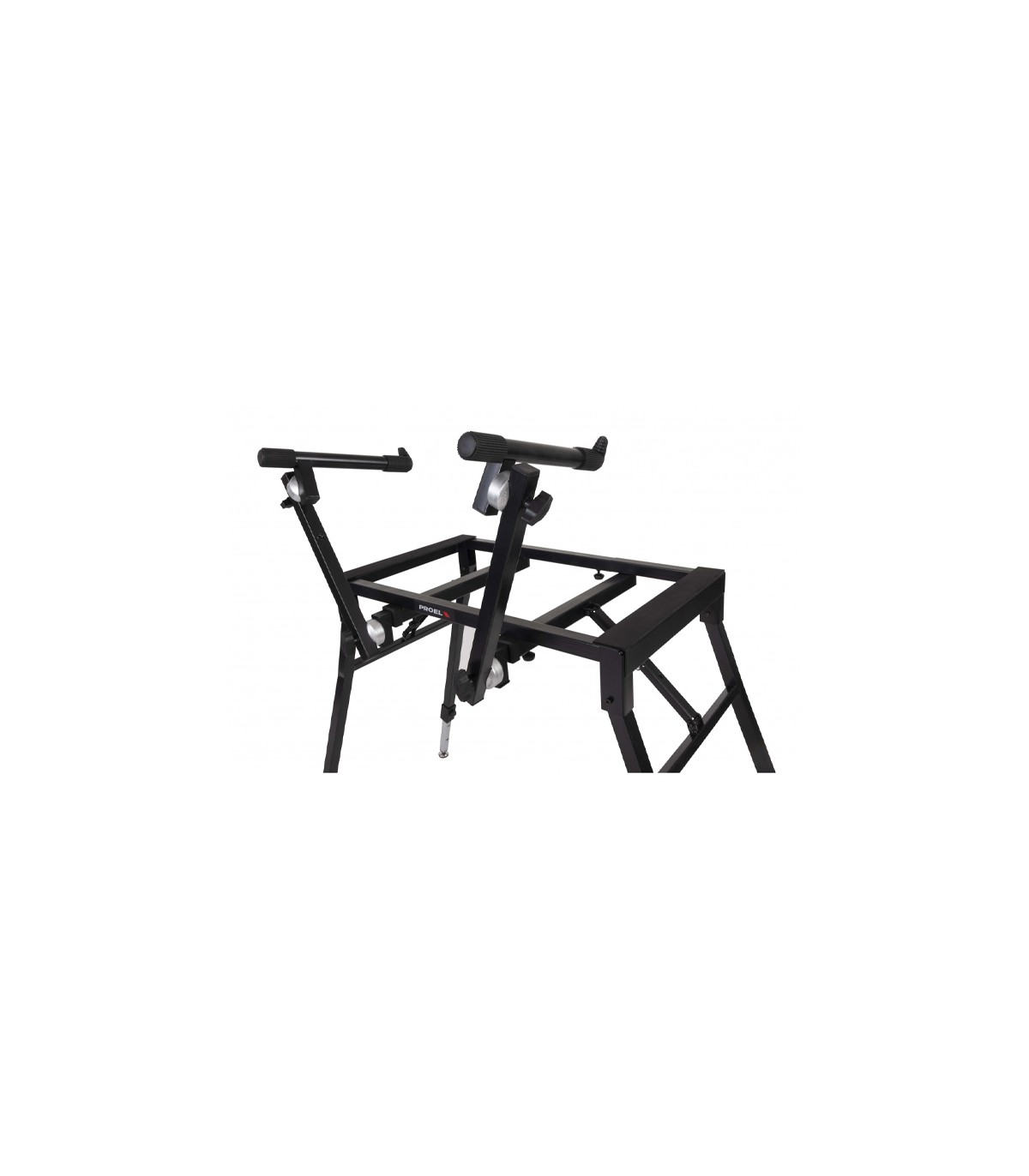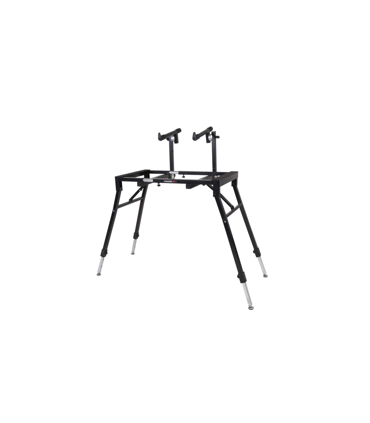 Base universal plegable para teclado EL260 PROEL , ajustable en ancho/altura con segundo nivel ajustable. Gracias a su mecanismo “EASY LOCK”, el ajuste de los niveles es sencillo y preciso. El diseño de EL260 permite el ajuste del ancho del soporte gracias a su estructura de tubo deslizante. Disponible en negro mate. Especial para teclados pesados gracias a soportar hasta 120 kilos de carga