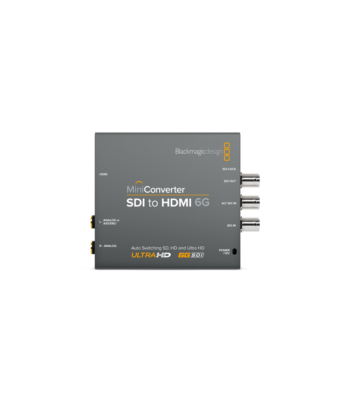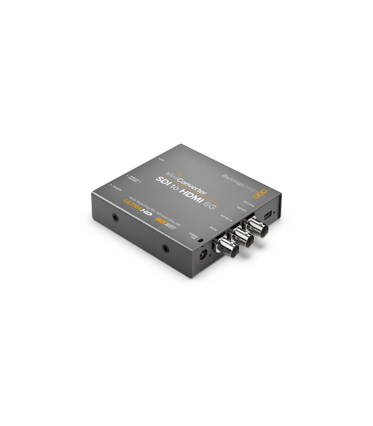 El mini convertidor Blackmagic Design SDI a HDMI 6G convierte SDI en resoluciones de hasta DCI 4K (4096 x 2160) a 24p y UHD 4K (3840 x 2160) hasta 30p a HDMI. Esto es útil para conectar dispositivos de consumo que requieren señales HDMI con equipos de video SDI profesionales. Con un factor de forma compacto y controles fáciles de usar, el Mini Converter es ideal para una variedad de aplicaciones de transmisión, postproducción y AV profesional.
