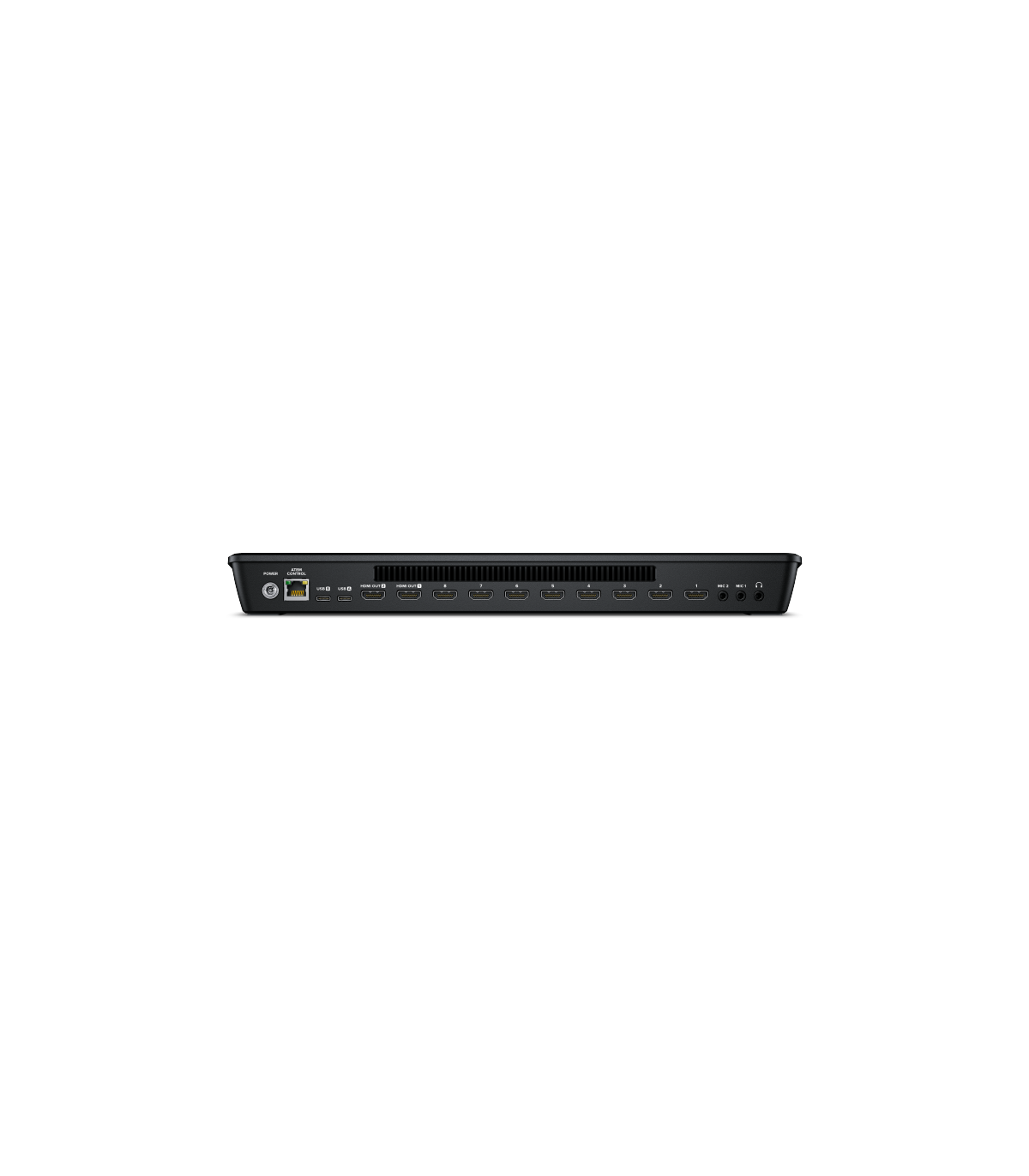 Mezclador de video profesional con 8 entradas HDMI, 16 ventanas de visualización simultánea, 4 compositores por crominancia avanzados, función SuperSource con 4 canales para efectos visuales, 2 salidas HDMI, 2 puertos USB y panel de control de mayor capacidad.