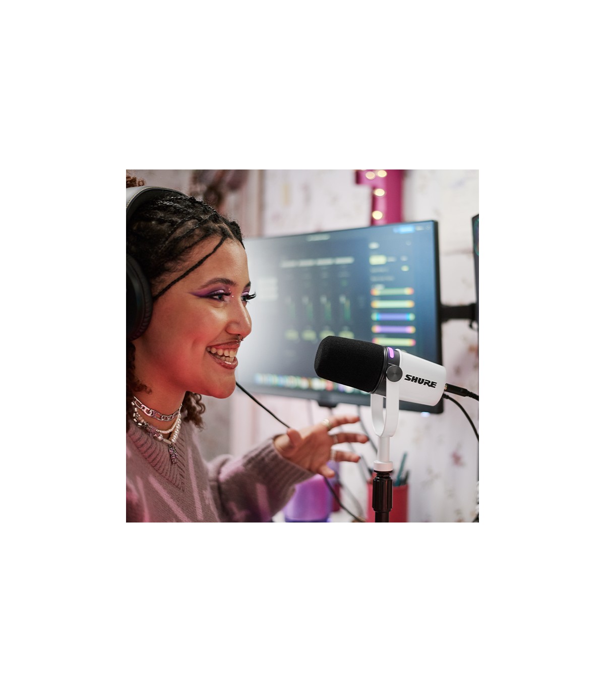 Renovado con un panel táctil LED personalizable, potentes funciones DSP y un audio aún mejor, el Micrófono para Podcast MV7+ es un micrófono dinámico diseñado para podcasters, streamers y músicos exigentes. Esta versión actualizada ofrece salidas USB-C y XLR, un Modo de Nivel Automático mejorado, así como un nuevo filtro digital de pops, un eliminador de ruido (Denoiser) en tiempo real y efectos de reverberación. Seleccione entre millones de opciones de colores para que su panel LED táctil de mute sea tan único como el audio que está grabando. Color blanco, dos años en garantía.