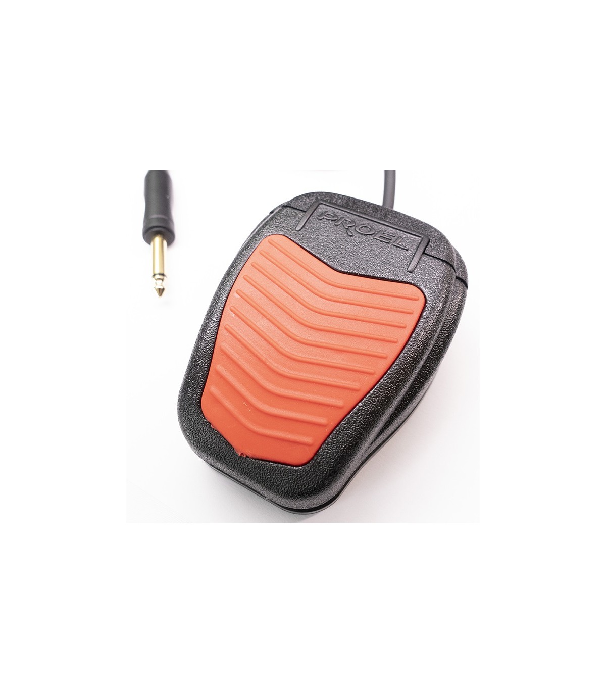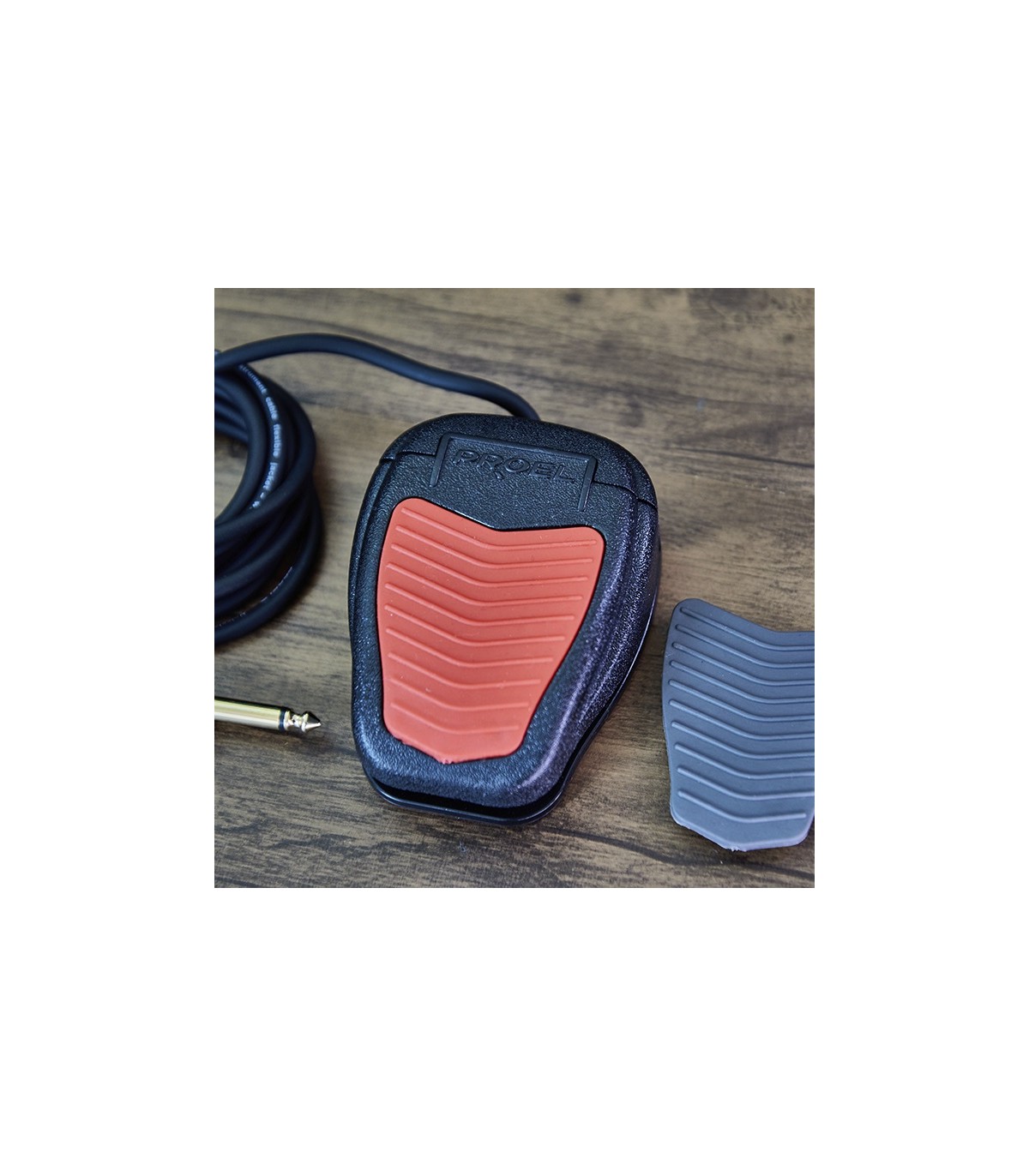 Pedal de control ABS DAMPER/HOLD/SUSTAIN GF29 PROEL de alta resistencia de la serie Golden Feet para teclados, sintetizadores, pianos digitales. Cuenta con interruptor de inversión de polaridad, suministrado con cable de 2mt terminado con conector jack macho estándar mono moldeado chapado en oro de ø 6,3 mm. incluye los 3 cauchos de colores para personalización del pedal rojo, negro y gris.