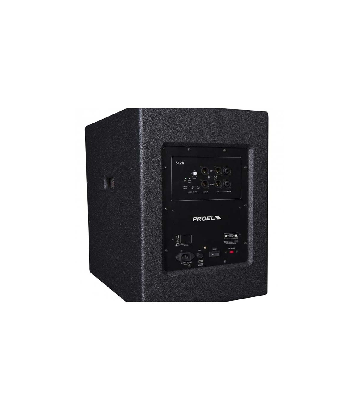 Subwoofer Proel S12AUS construido en poliuretano.Configuración acústica de HYBRID BAND PASS (HBS).Etapa de potencia clase D con SMPS. X-Over integrado de 2 canales para operaciones individuales o 2 + 1, Subwoofer de 12’’, 600W