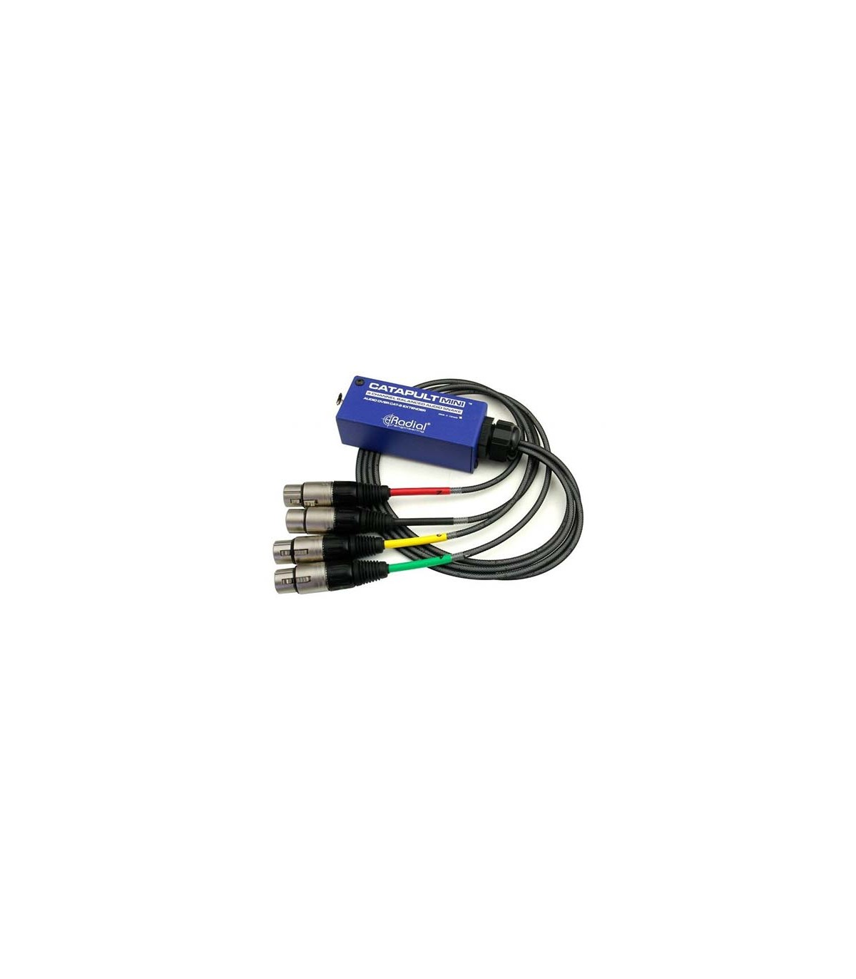 El Radial Catapult MINI TX es un ingenioso invento. Cuando se combina con el Catapult MINI RX, le permite transformar un cable Cat 5 estándar en un snake analógica de 4 canales. Simplemente conecte un cable Cat 5 blindado entre los dos módulos, y usarán los conductores analógicos del cable para entregar cuatro líneas de audio equilibradas a cualquier destino que elija.